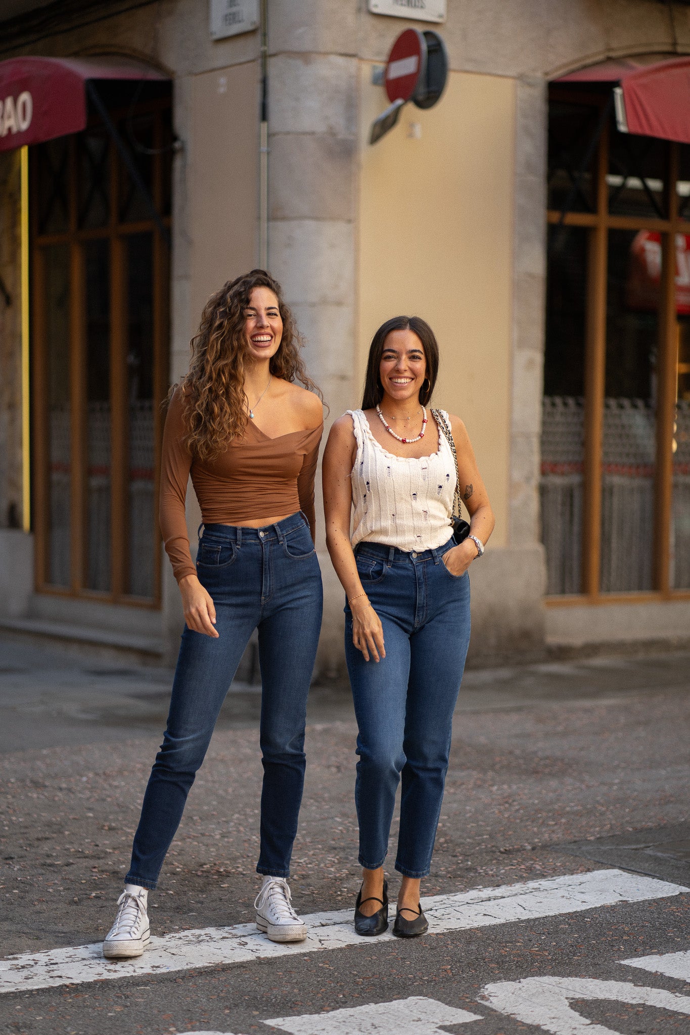 La modelo principal mide 179 cm y lleva una S. La modelo secundaria mide 168 cm y lleva una M.
